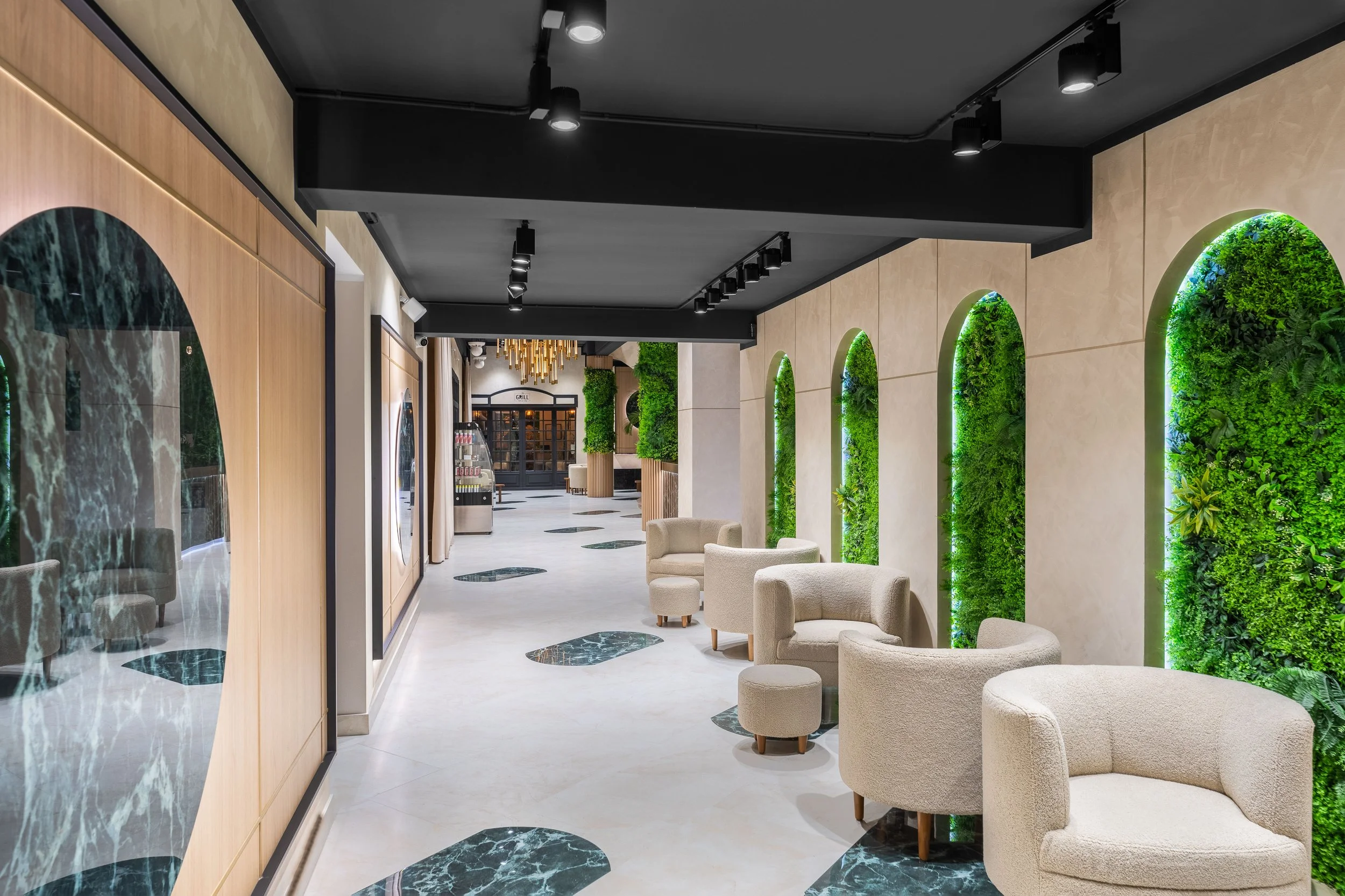 Amenajarea a urmărit principiile stilului biofilic, adică integrarea naturii în interior. Alături de plante, copaci, finisaje precum lemn, am folosit nuanțe calde de ceramică inspirată de piatra naturală care în anumite zone, pentru un efect dramatic, a fost pusă în contrast cu ceramica tip marmură neagră. Elemente precum accentele de alamă, iluminat premium au fost folosite tocmai pentru a reaminti întotdeauna de stilul high end al acestui mediu.